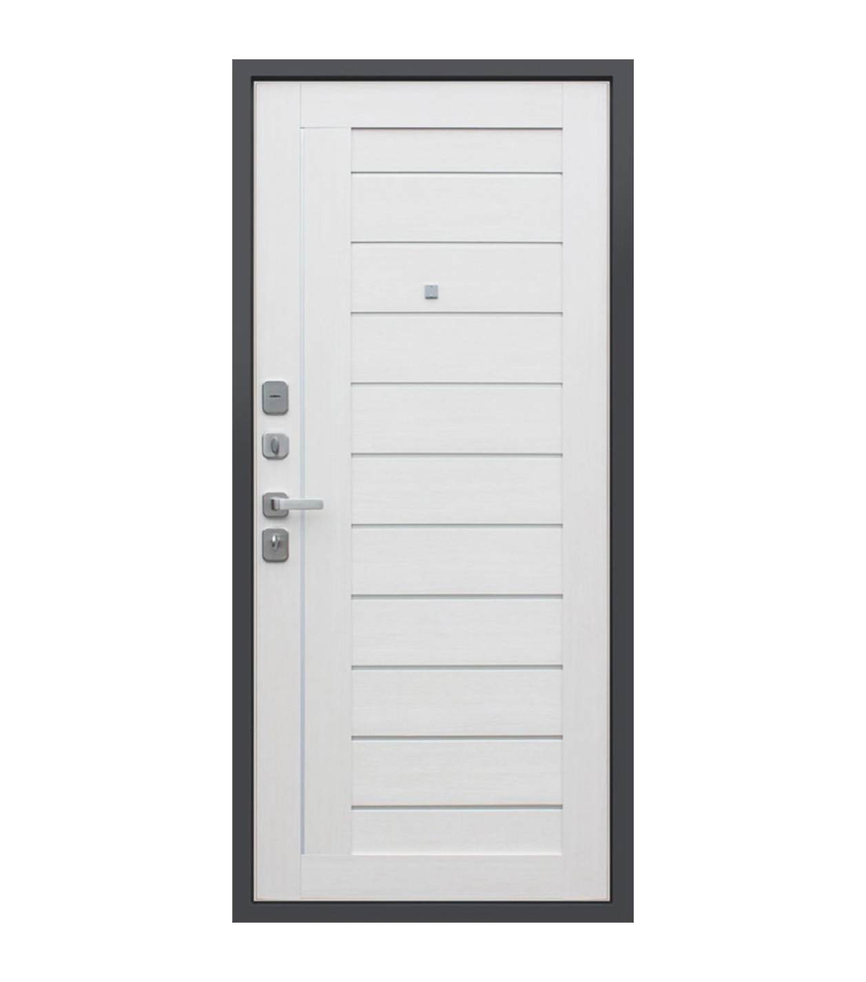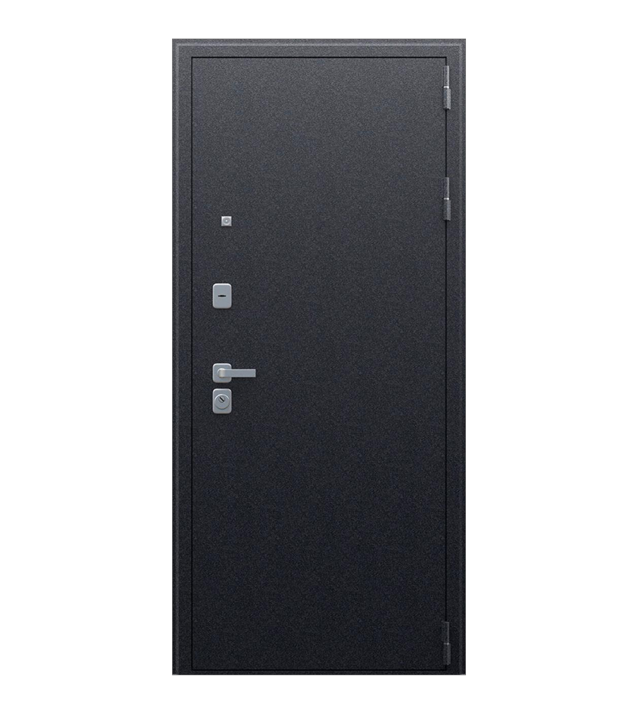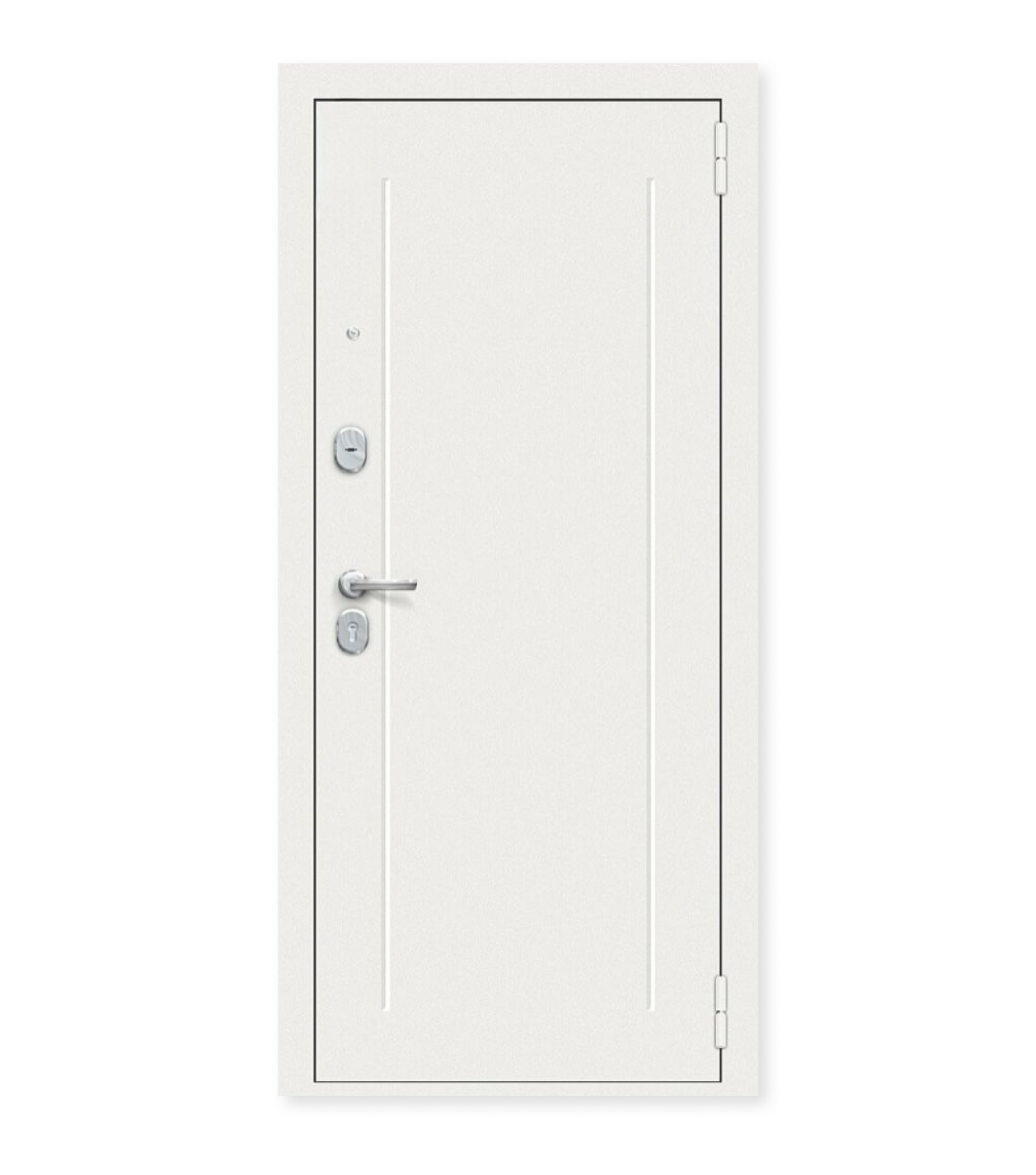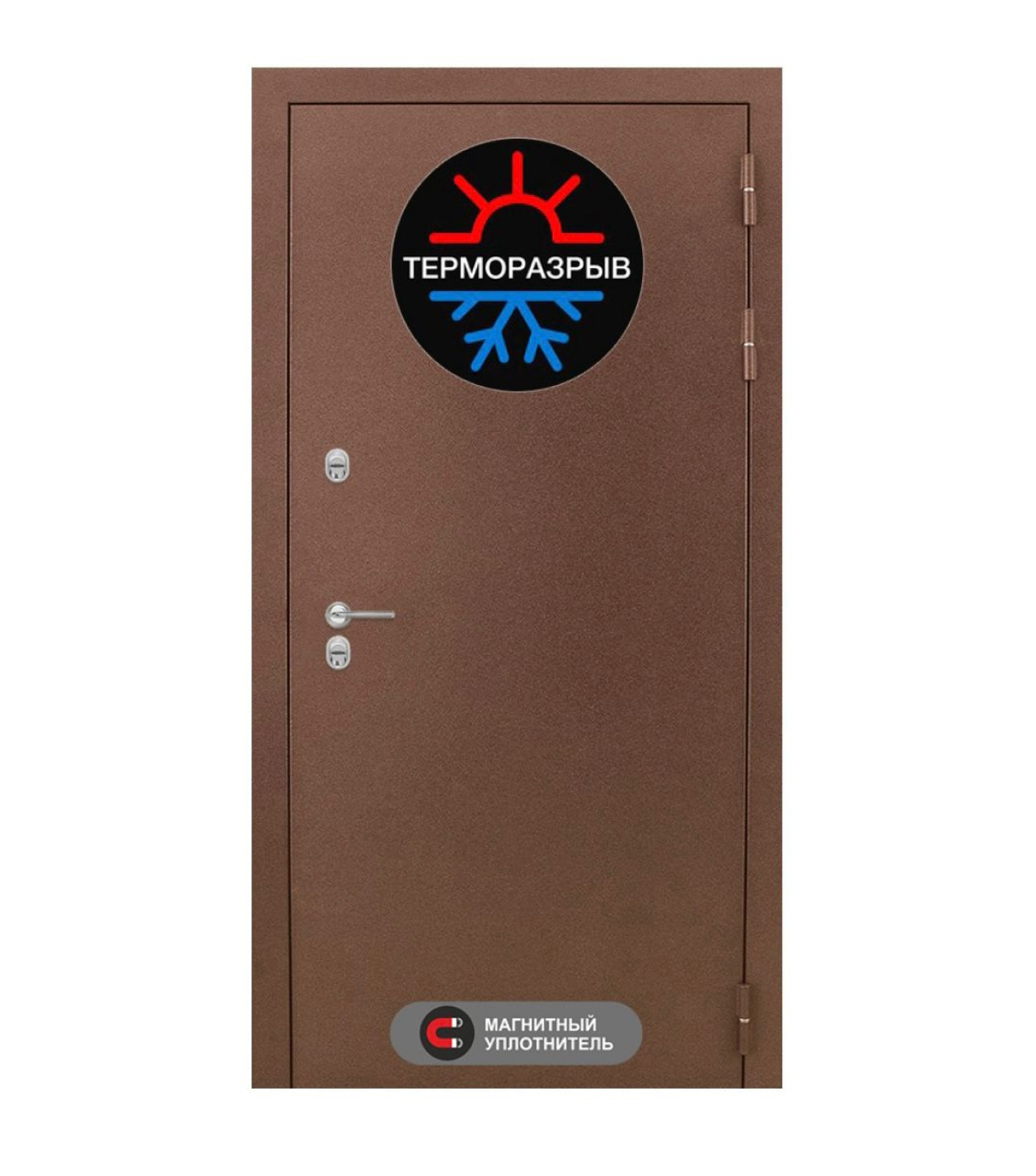 Внутри её конструкции есть специальный слой (как «перемычка»), который разделяет холодный внешний металл и тёплый внутренний. Благодаря этому дверь не покрывается инеем и на ней не появляется конденсат.
